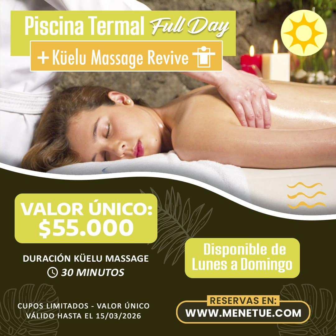 Ven a disfrutar de un día de relajo en nuestras piscinas. Llénate de energía con nuestras aguas termales Menetue y aprovecha de relajarte en un entorno maravilloso